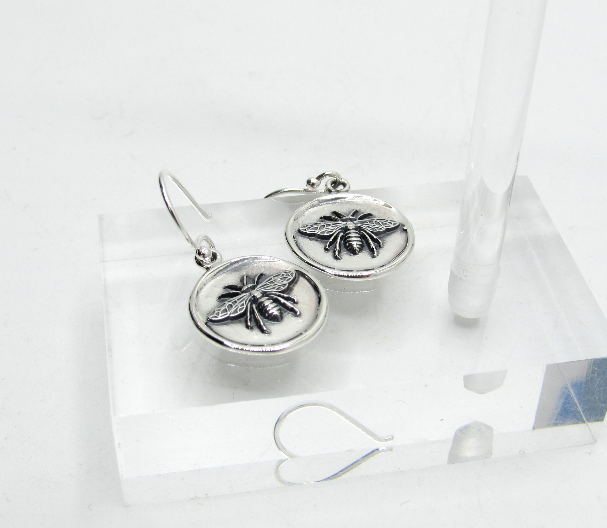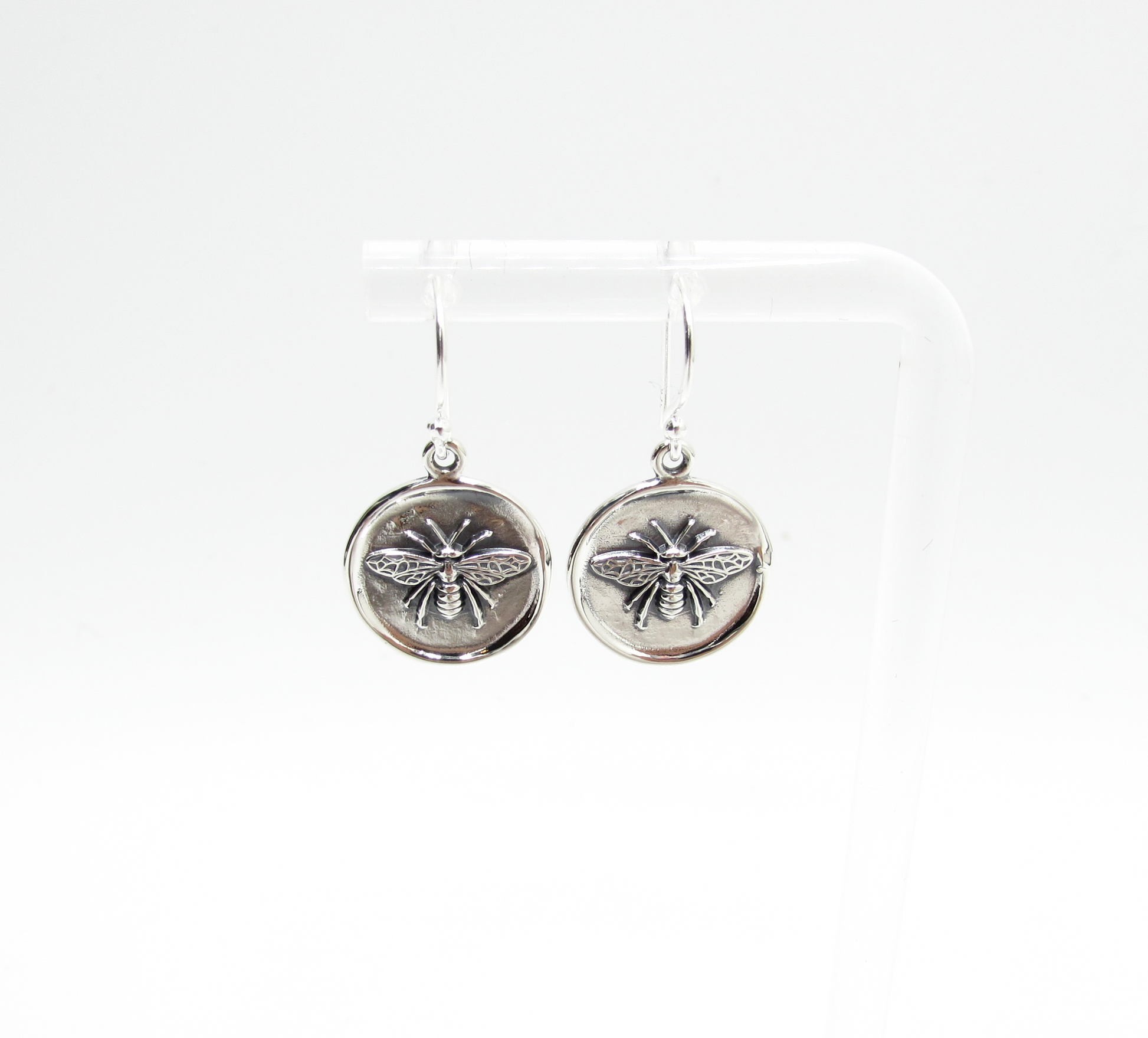 10.6mm silver wax stamp bee on a traditional hook style finding