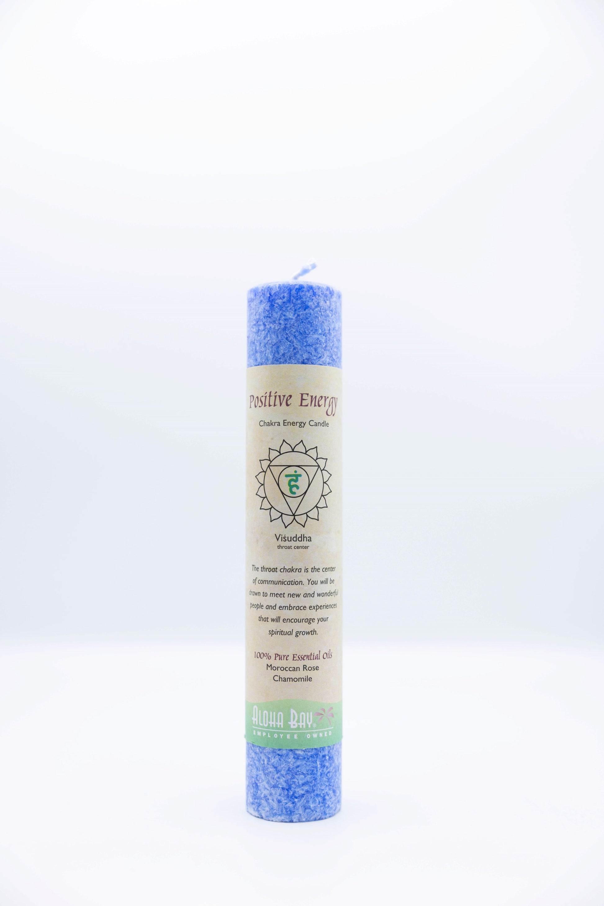 Our Chakra Energy Pillar - Positive Energy , representing the Throat chakra in a soothing blue hue. Infused with Moroccan Rose and Chamomile, this candle fosters communication and connection, inviting new experiences and spiritual growth. Illuminate your space and open the door to positivity with our enchanting Positive Energy candle.