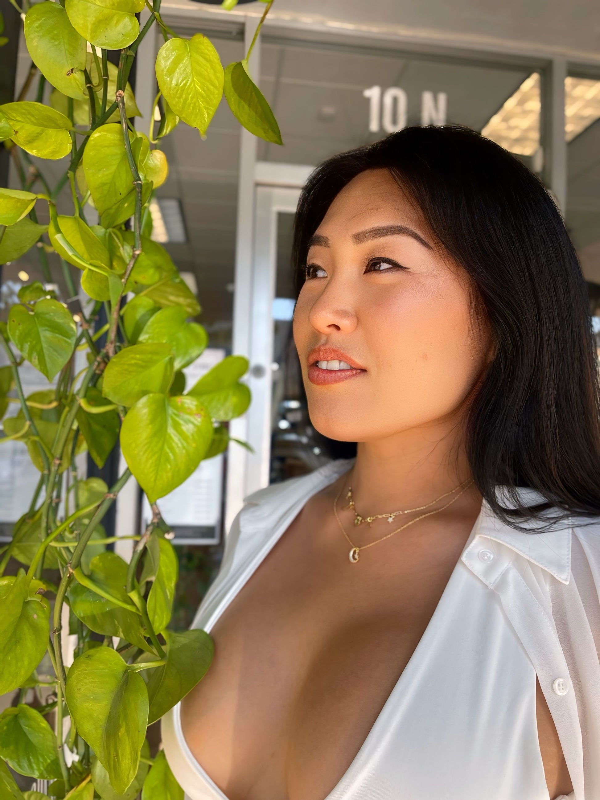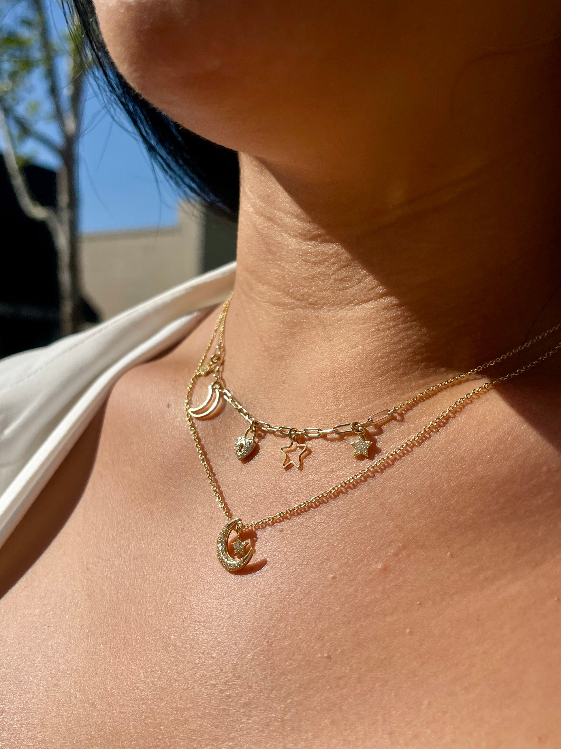 Gold paperclip charm necklace with CZ heart locket center, crescent moon, star outline, CZ star, and CZ north star totaling 6 charms.