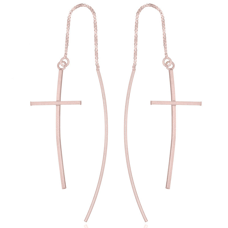 Curved Cross on a threader style earring available in Silver, Yellow Gold, and Rose Gold