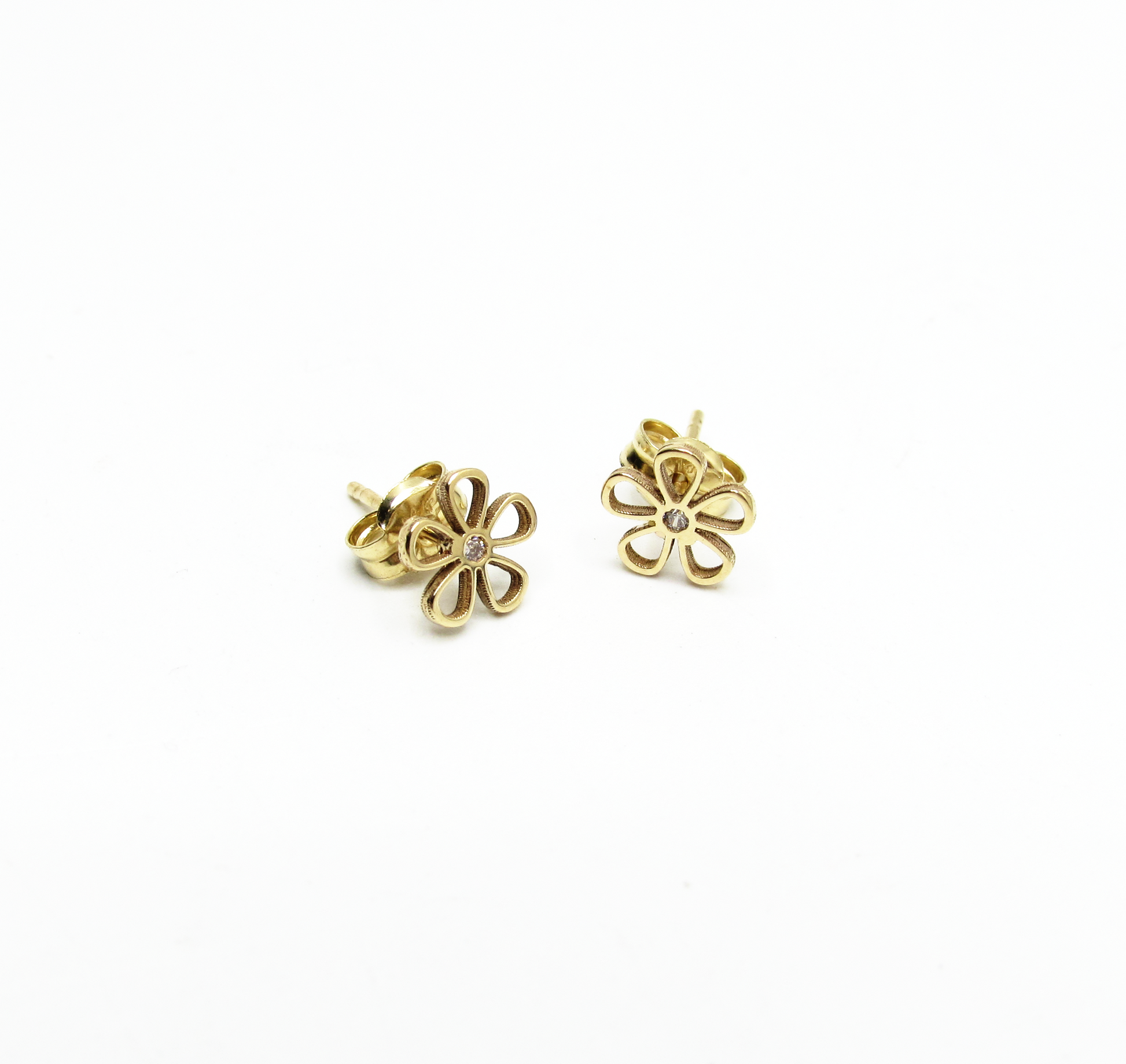 Flower outline Studs with CZ center available in mini and small sizes.