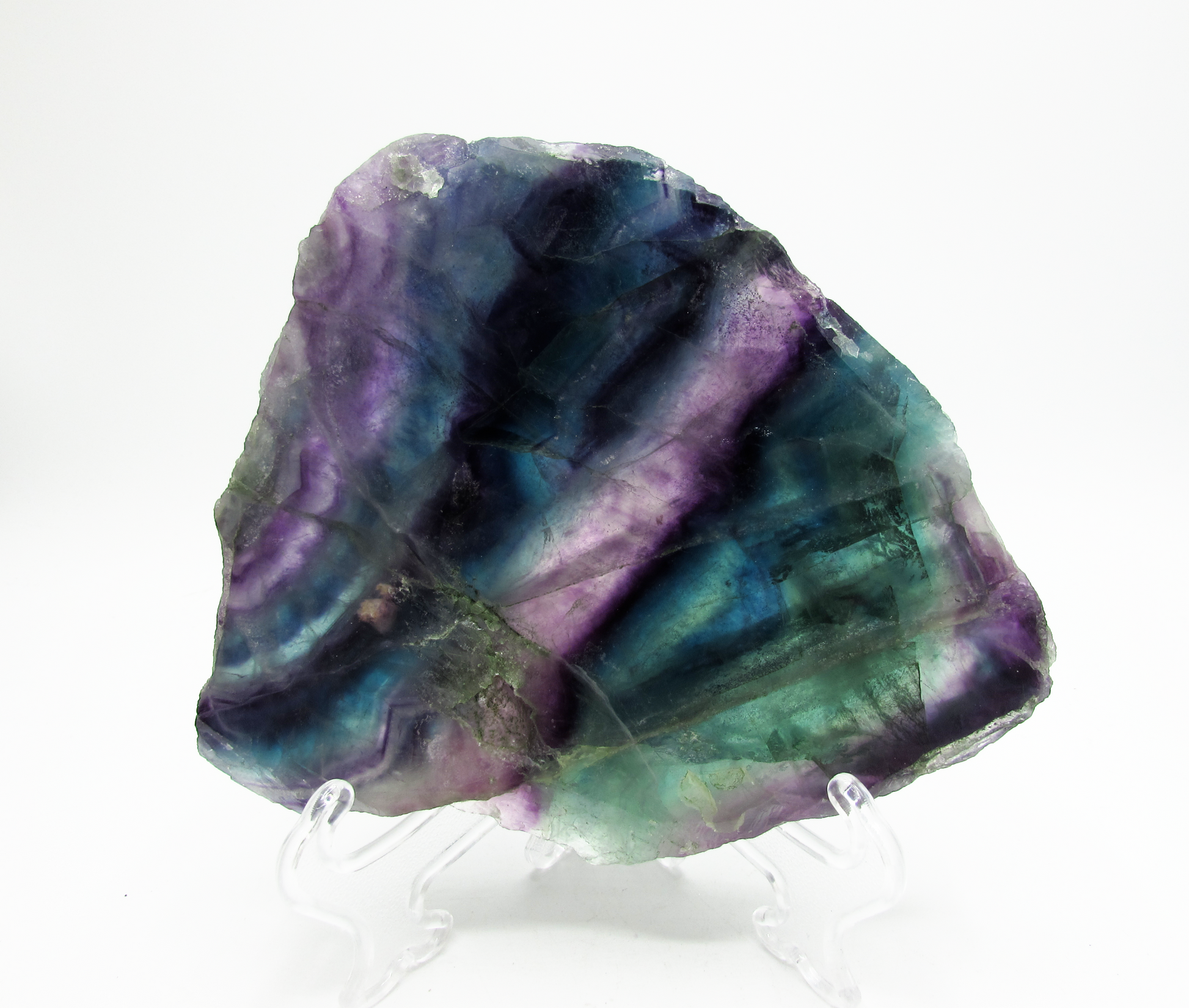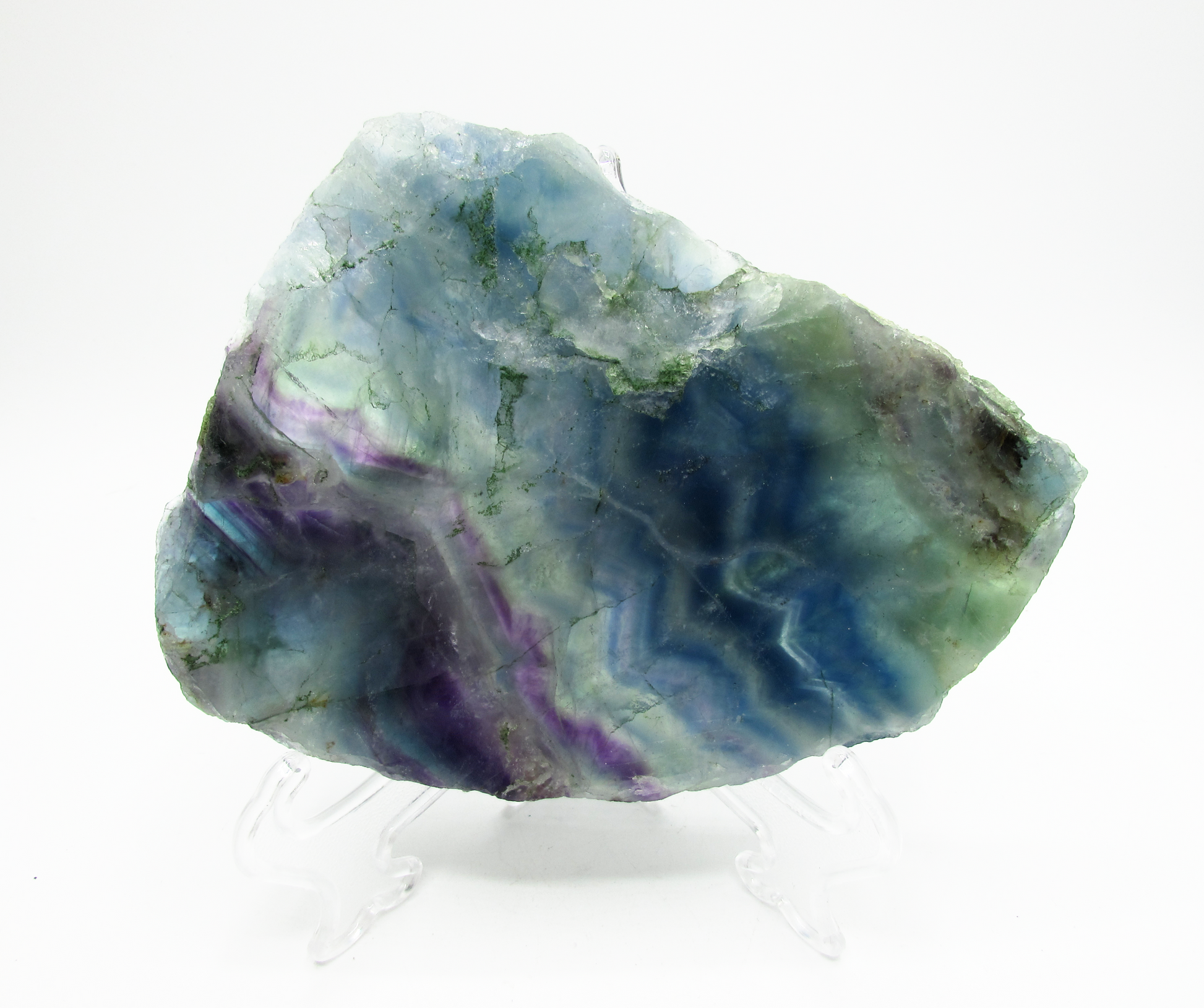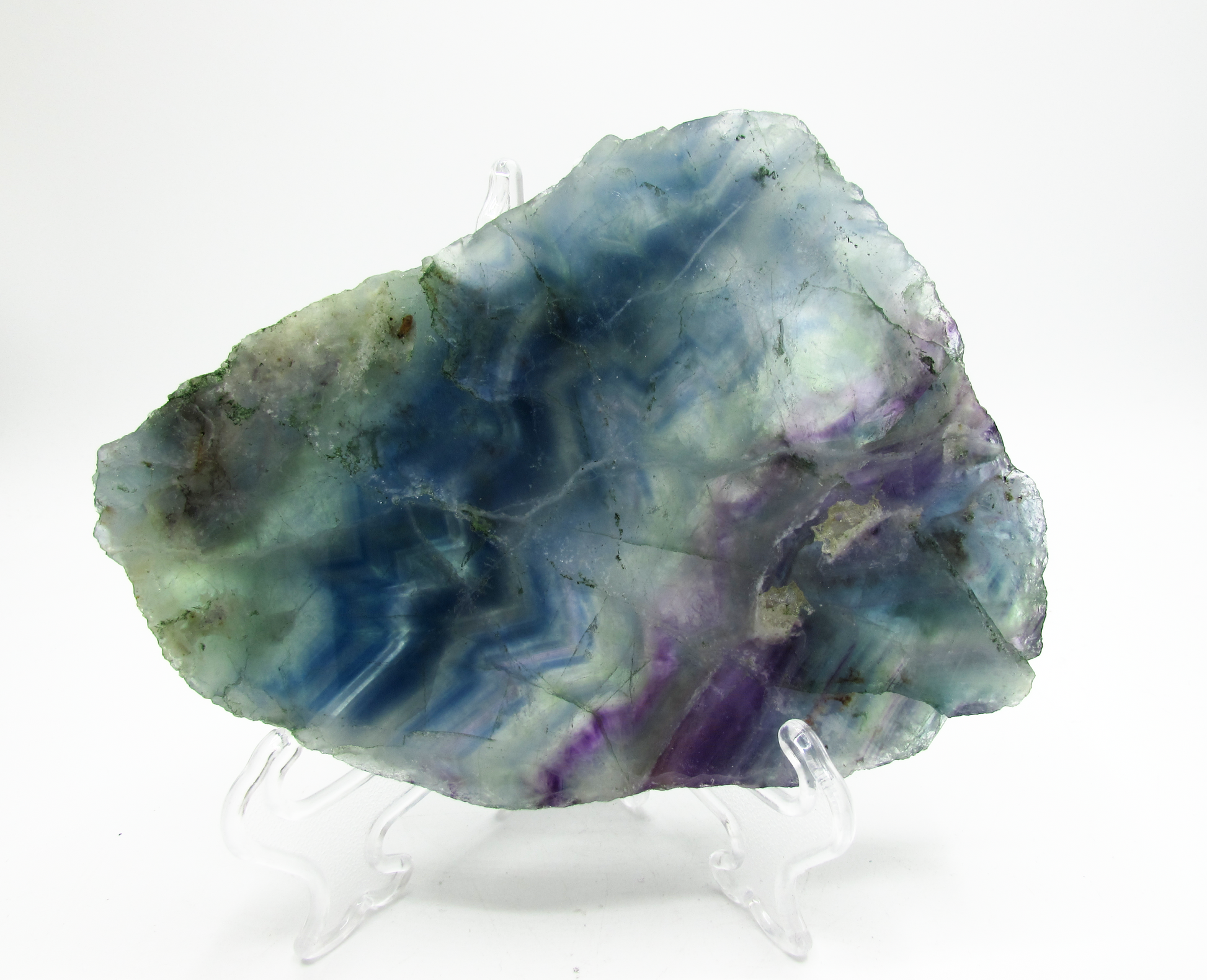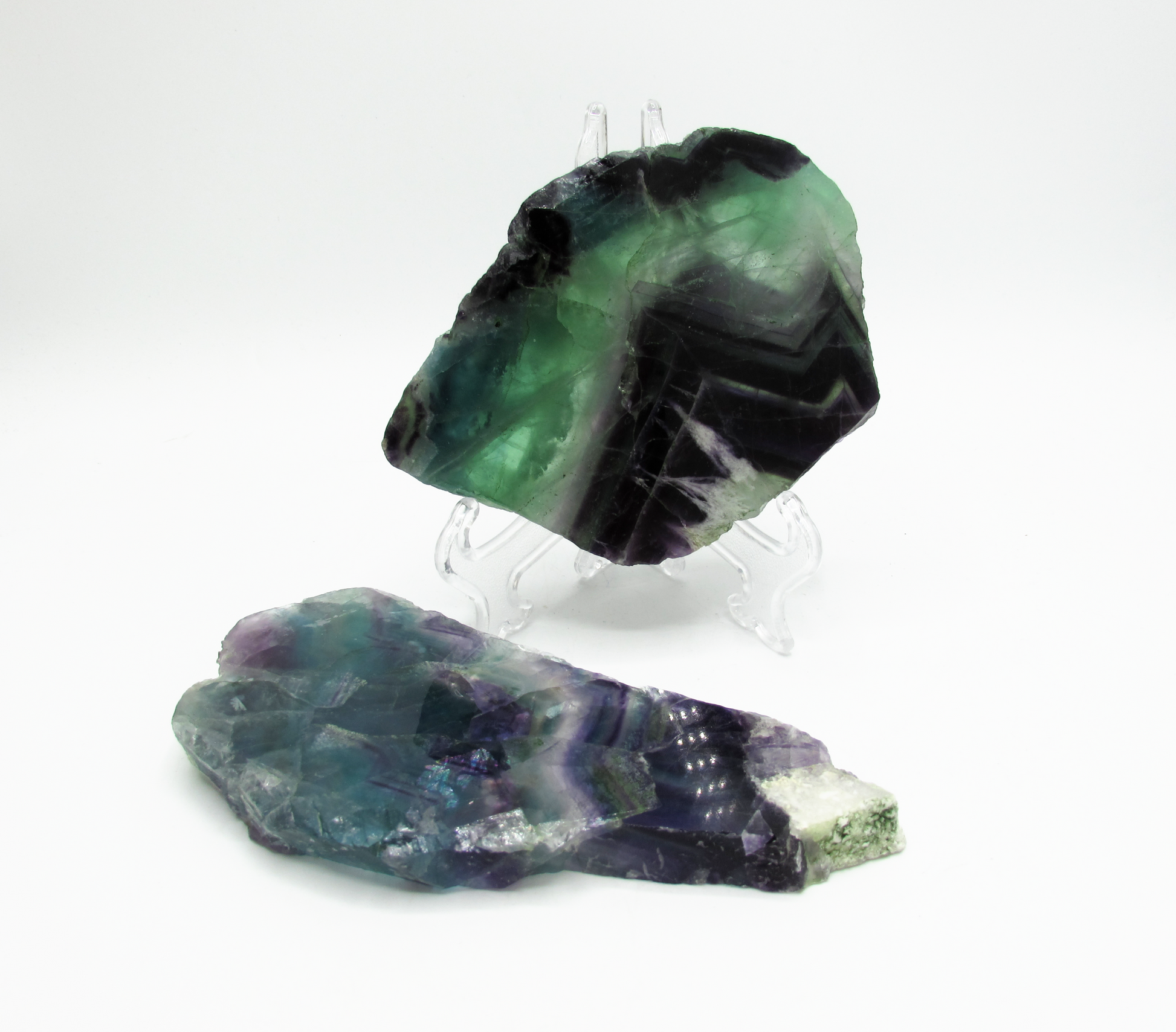 Stunning swirls of purples, greens, blues, and clear tones make these fluorite slabs stand out as a true one-of-a-kind piece.
