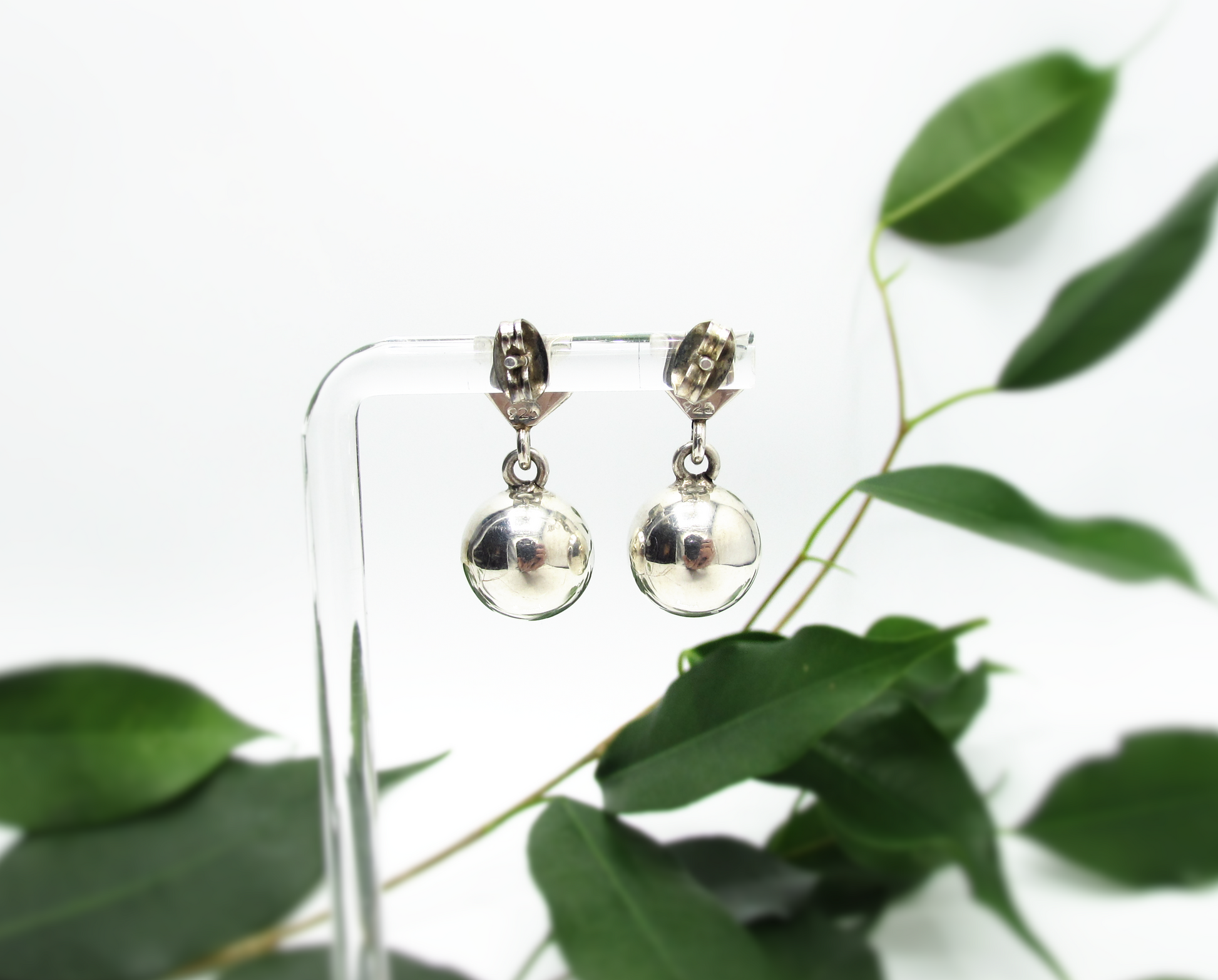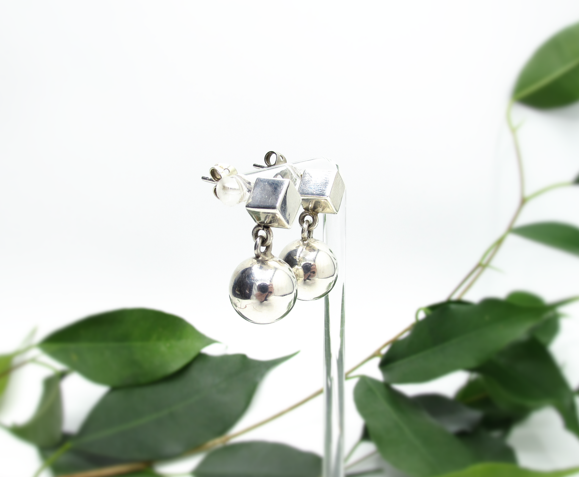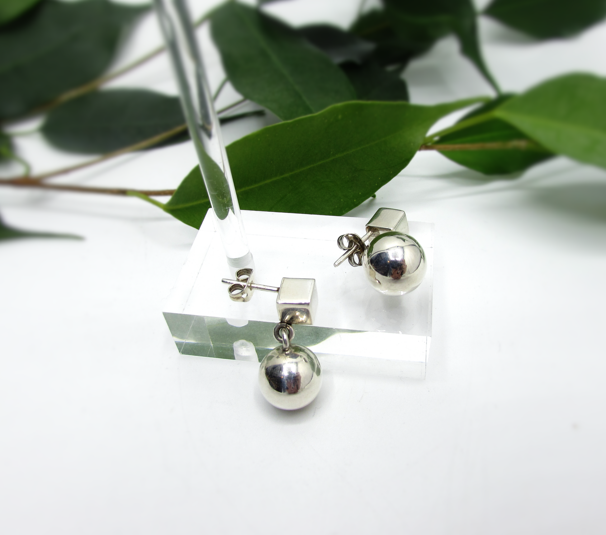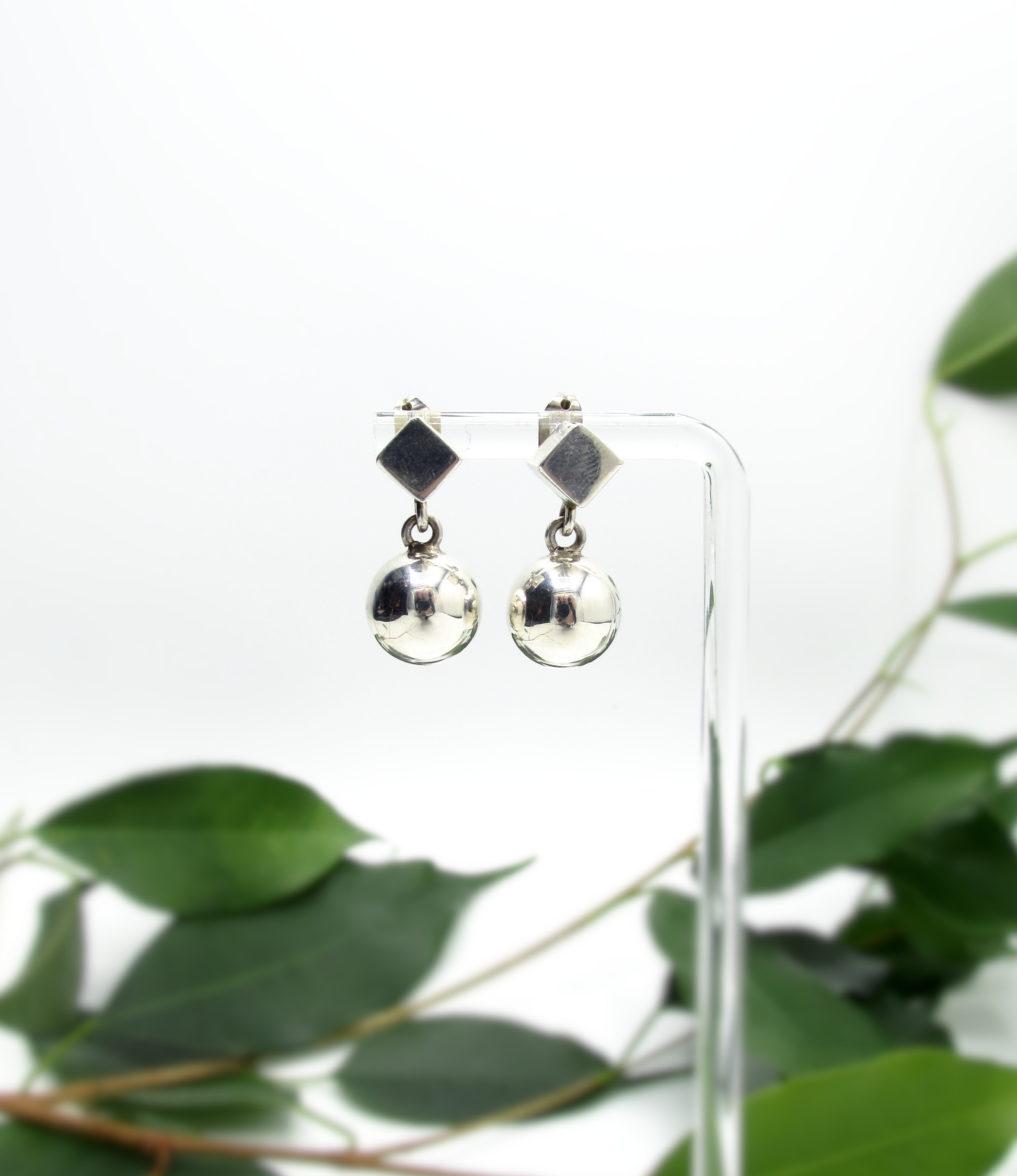 Handmade .925 Sterling Silver Earrings with a Square-shaped stud and a hanging Silver Ball