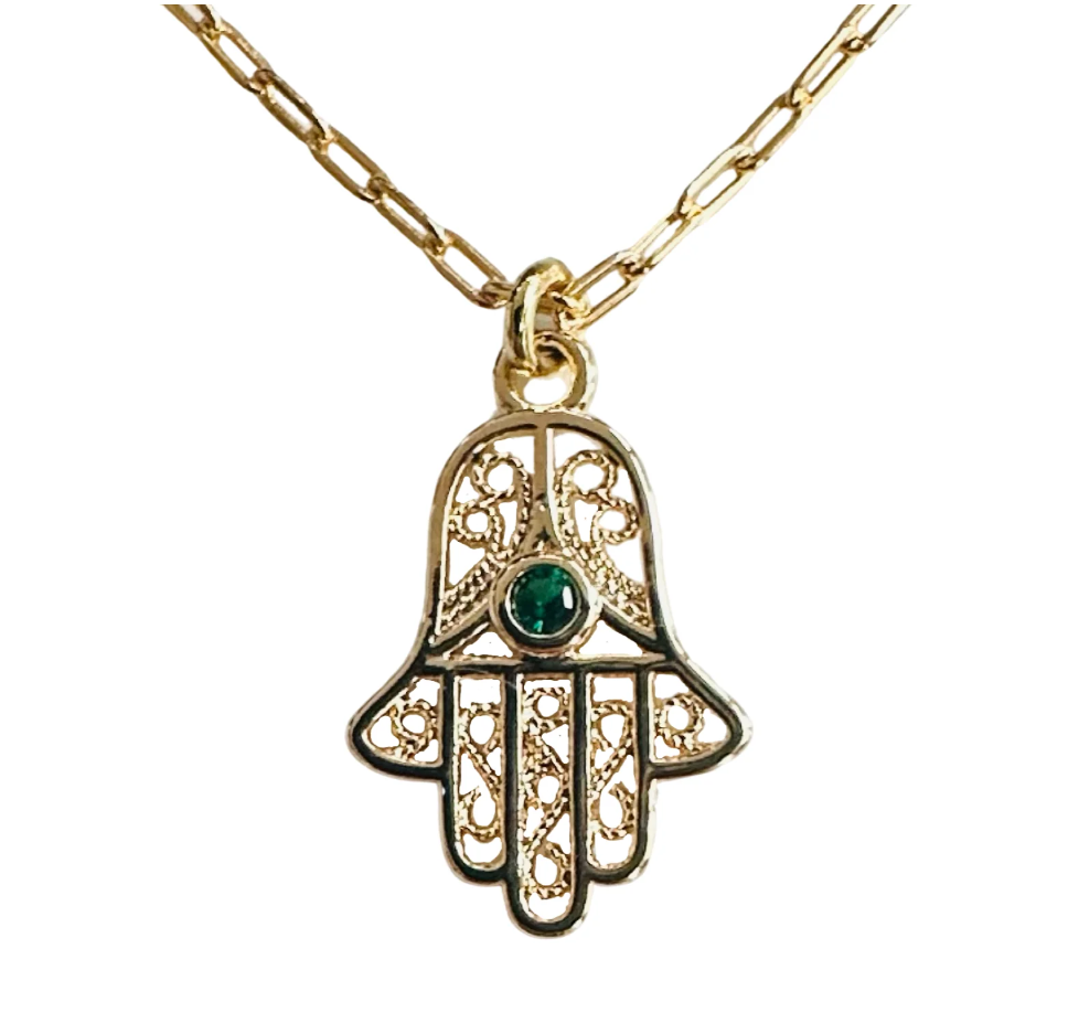 Hamsa necklace with green CZ center on mini paperclip chain.
