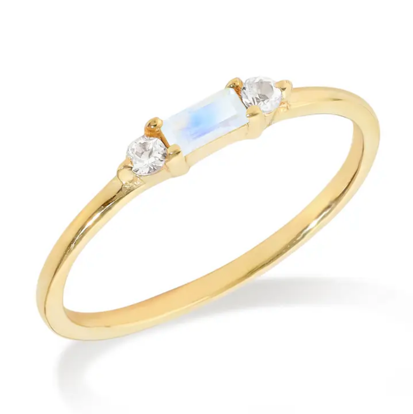 Each ring is crafted with a luminous rectangular moonstone, selected for its natural glow and subtle flashes of light, making every piece uniquely radiant.