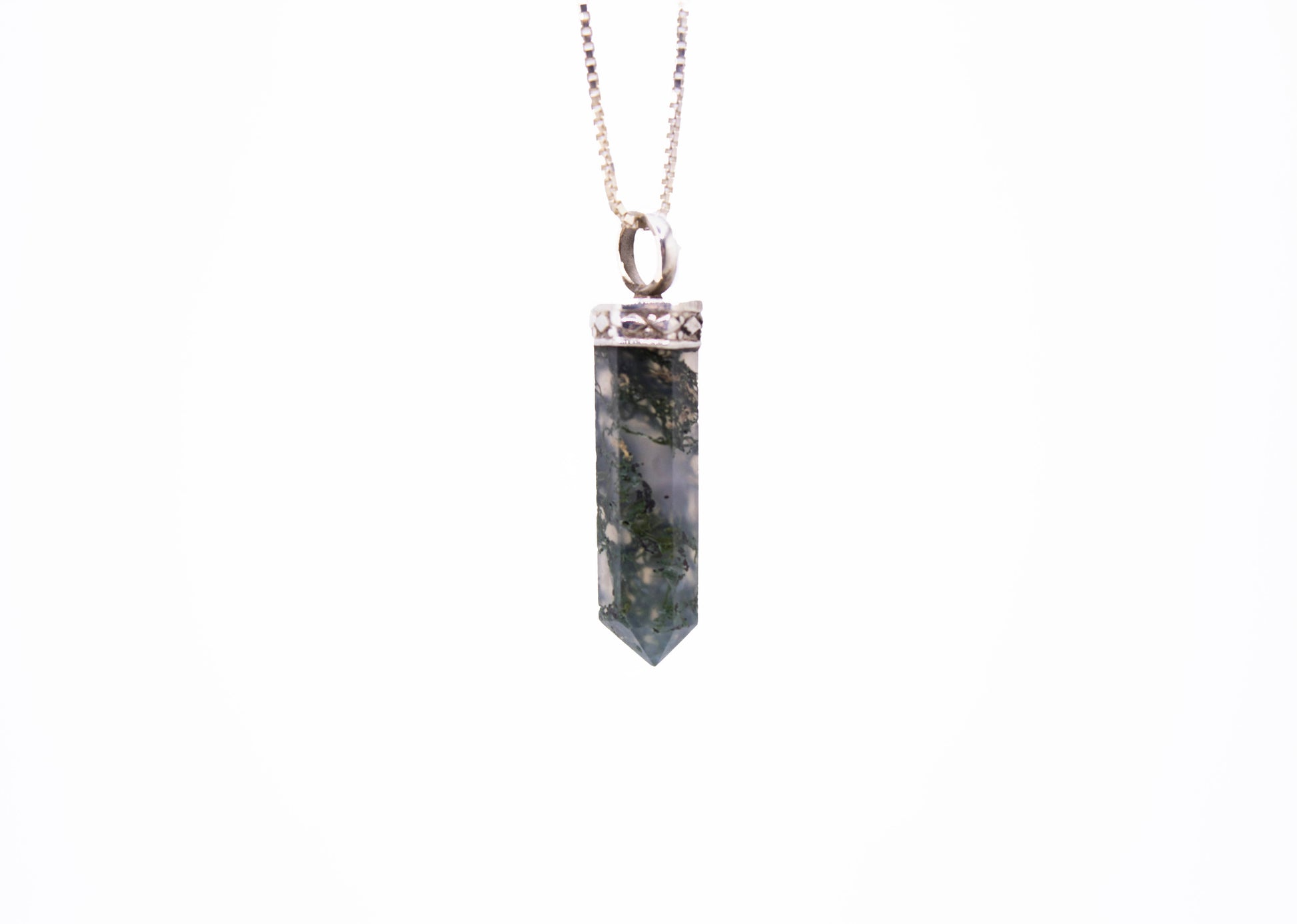 Moss Agate Mini Crystal Point Pendant .925 Adj Chain