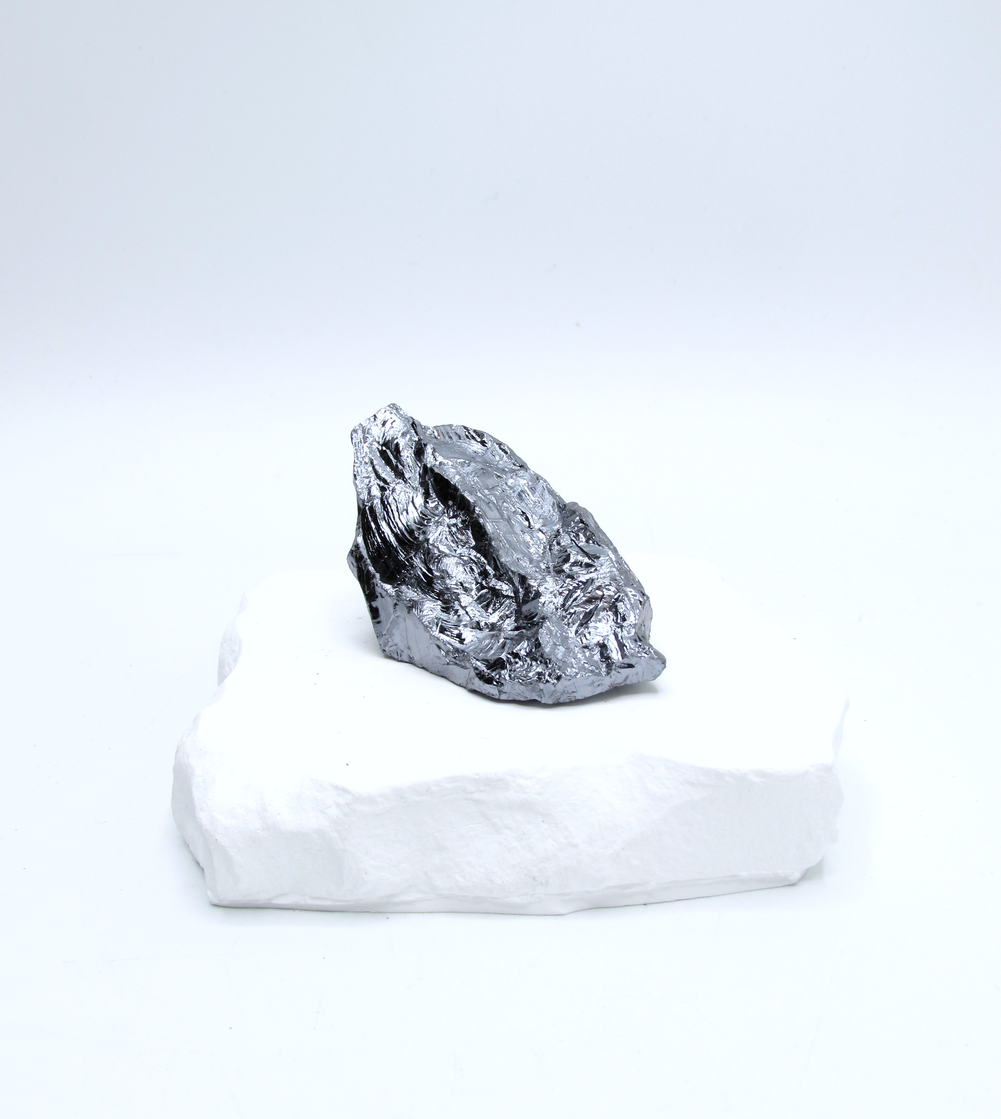 Raw silicon metal displays a striking silvery metallic luster with sculptural, fractured surfaces that reflect light in a mirror-like way. Each piece carries a bold, almost futuristic appearance that stands apart from traditional crystals.