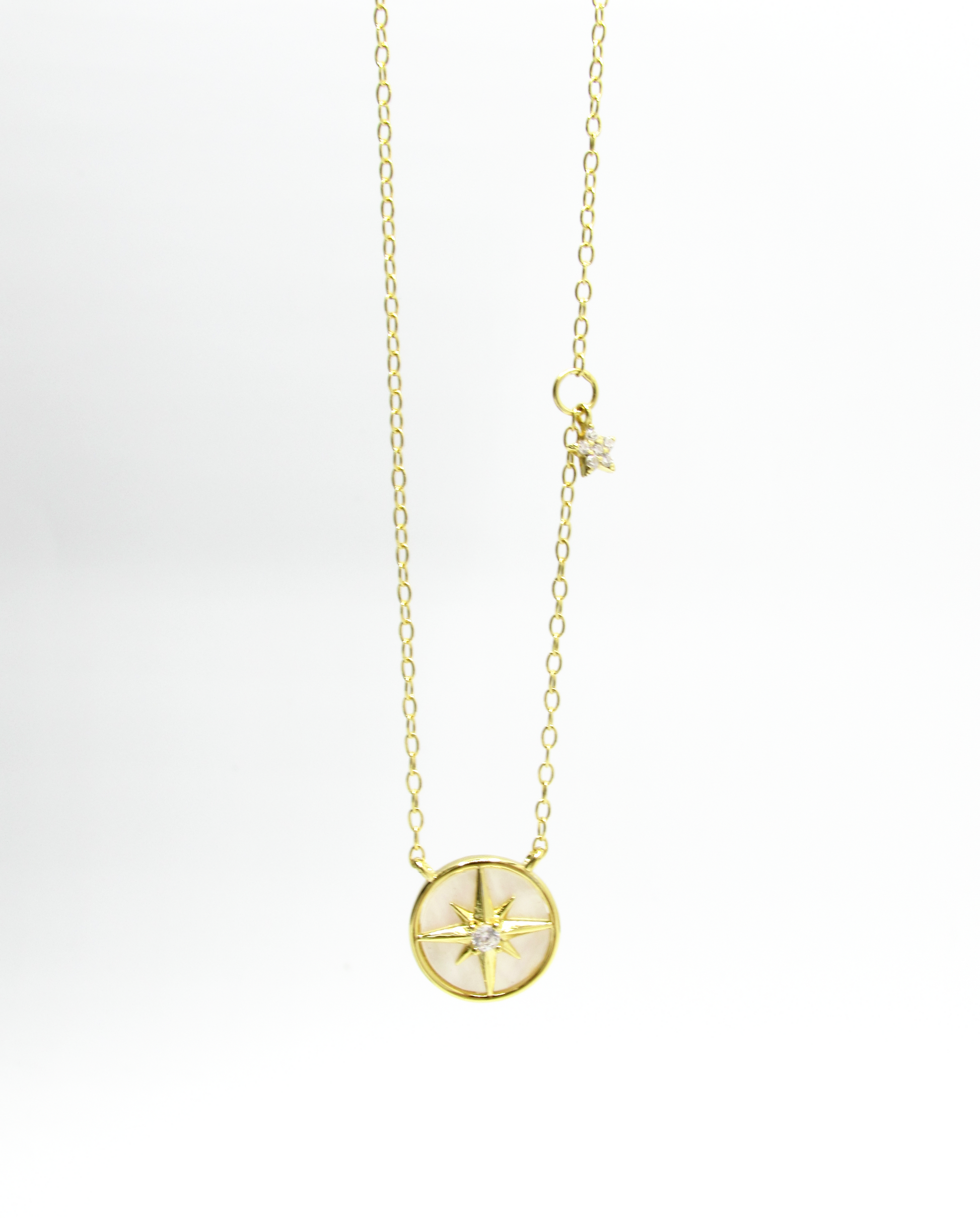Mother of Pearl Starburst necklace with dainty dangling star charm.