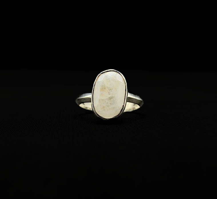 Stunning Rainbows and Blue Streaks Peek Through This Faceted Rainbow Moonstone Oval Ring.