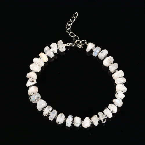 Natural rondelle wheel beaded Rainbow Moonstone bracelet with approximately 30 stones measuring about 5x7mm.