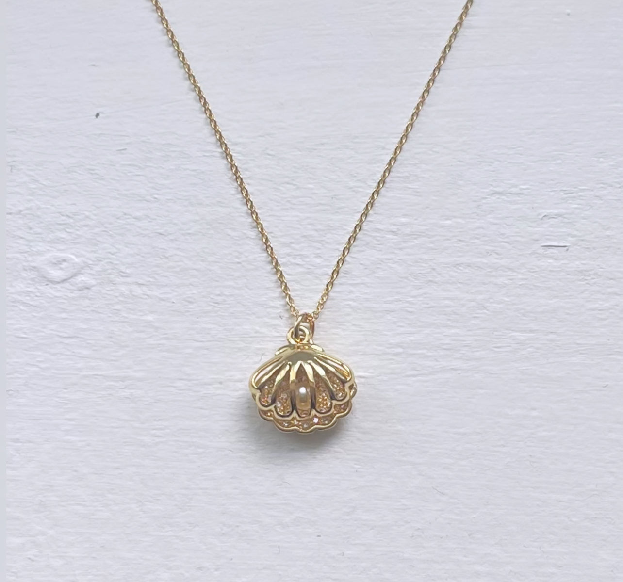 Enchanting shell necklace that opens up to CZ accents and pearl center.