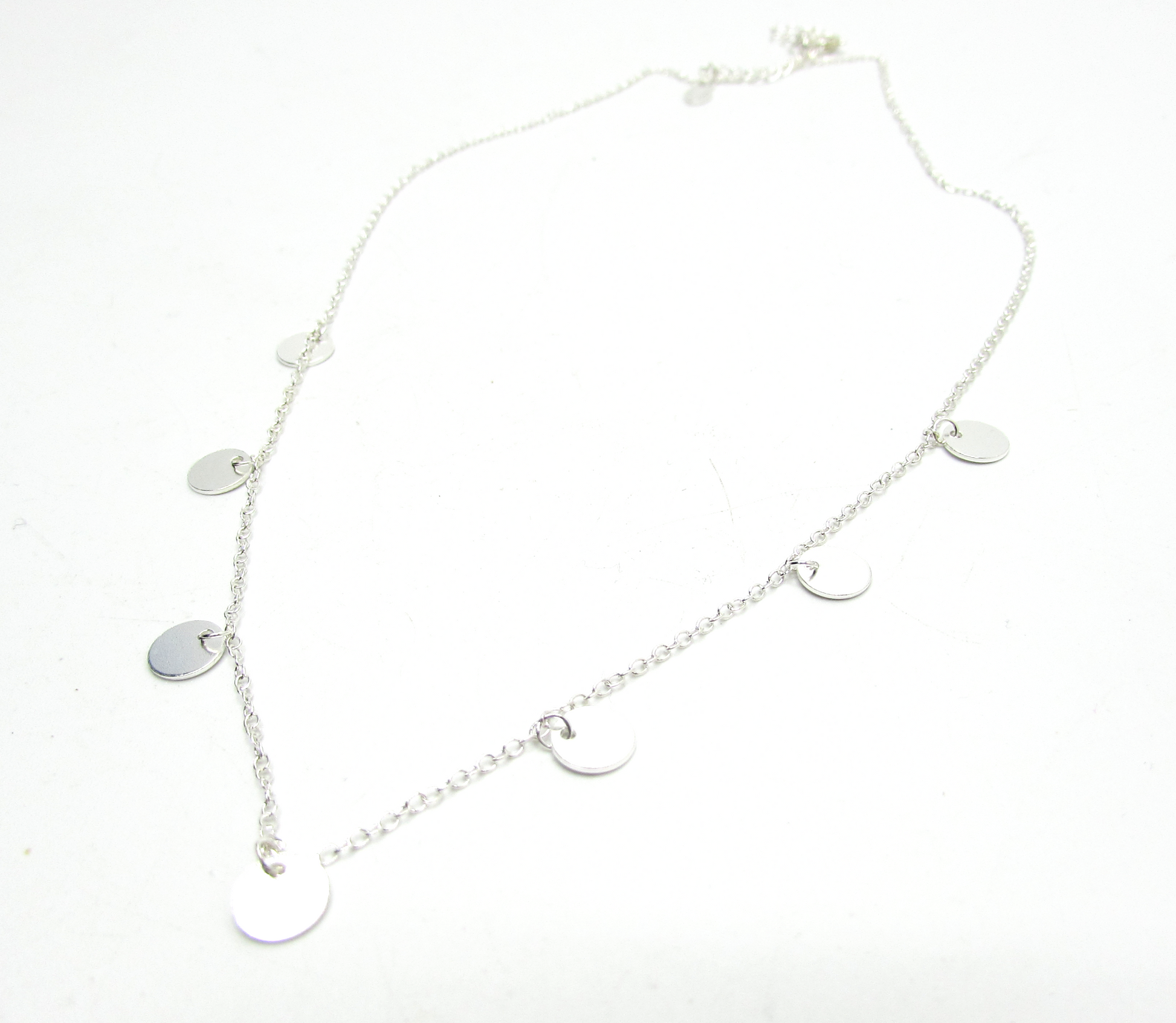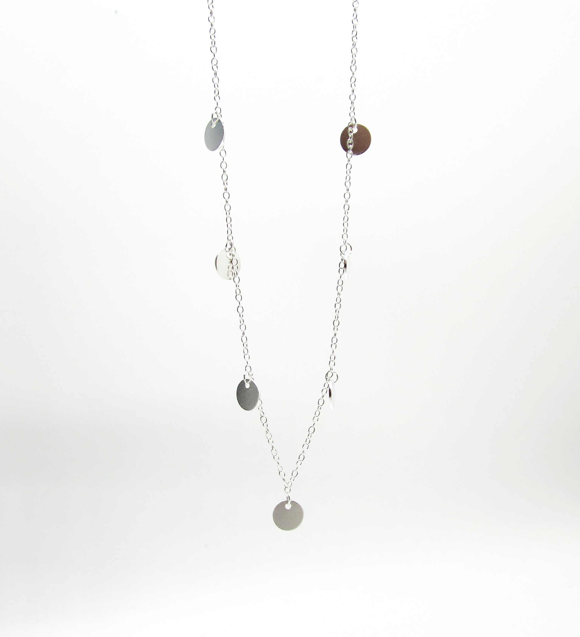 Delicate necklace with small round silver charms to achieve the perfect glistening layered look!
