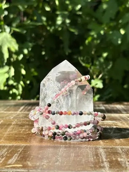 Brilliant watermelon tourmaline stretch bracelet stone size 4mm. Approximately 42 to 53 stones per bracelet. Length 7.5 inches.
